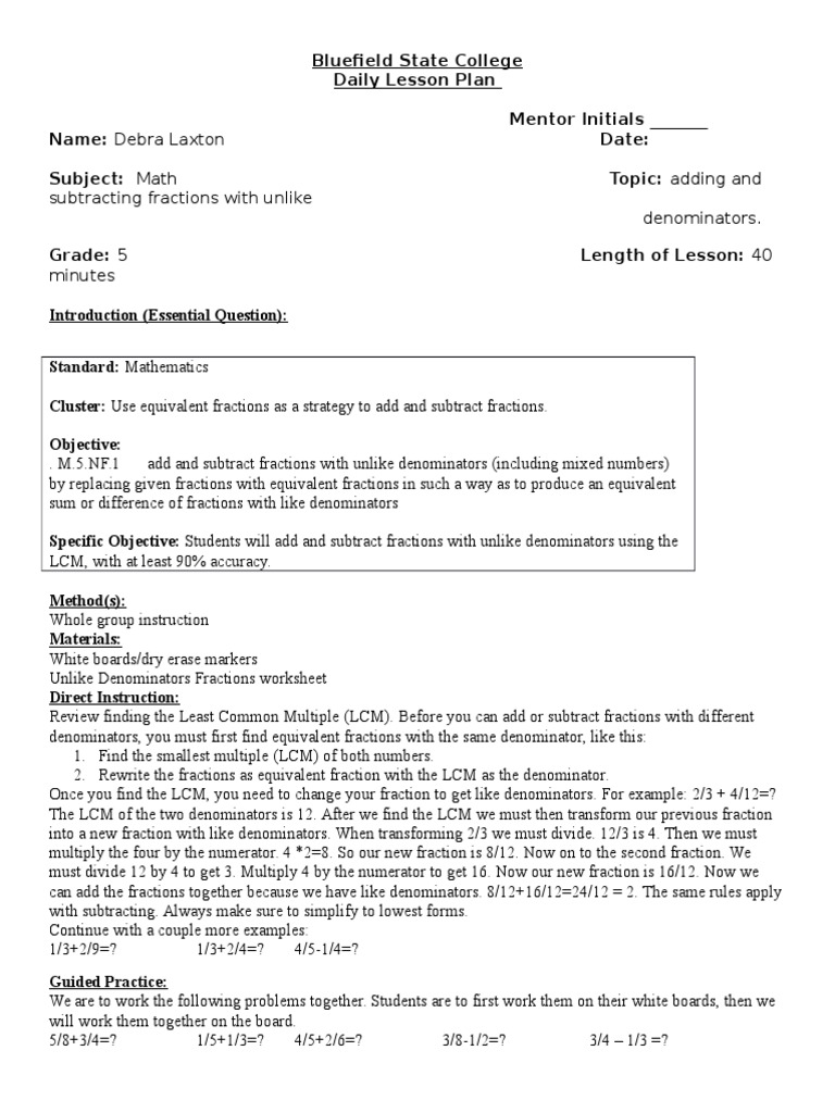 Fractions Add Subtract Unlike Denominators Lesson Plan