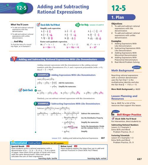 Holt Algebra 10 5a Add Subtract Rational Expressions Like