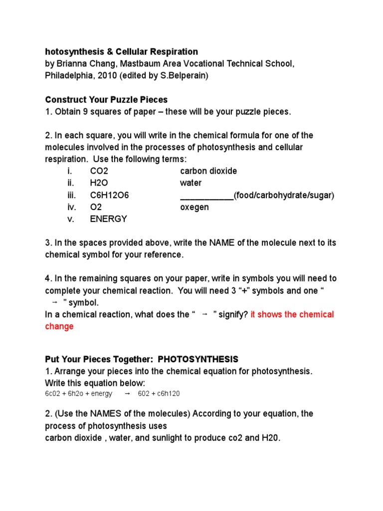 Photosynthesis And Cellular Respiration Worksheet Photosynthesis