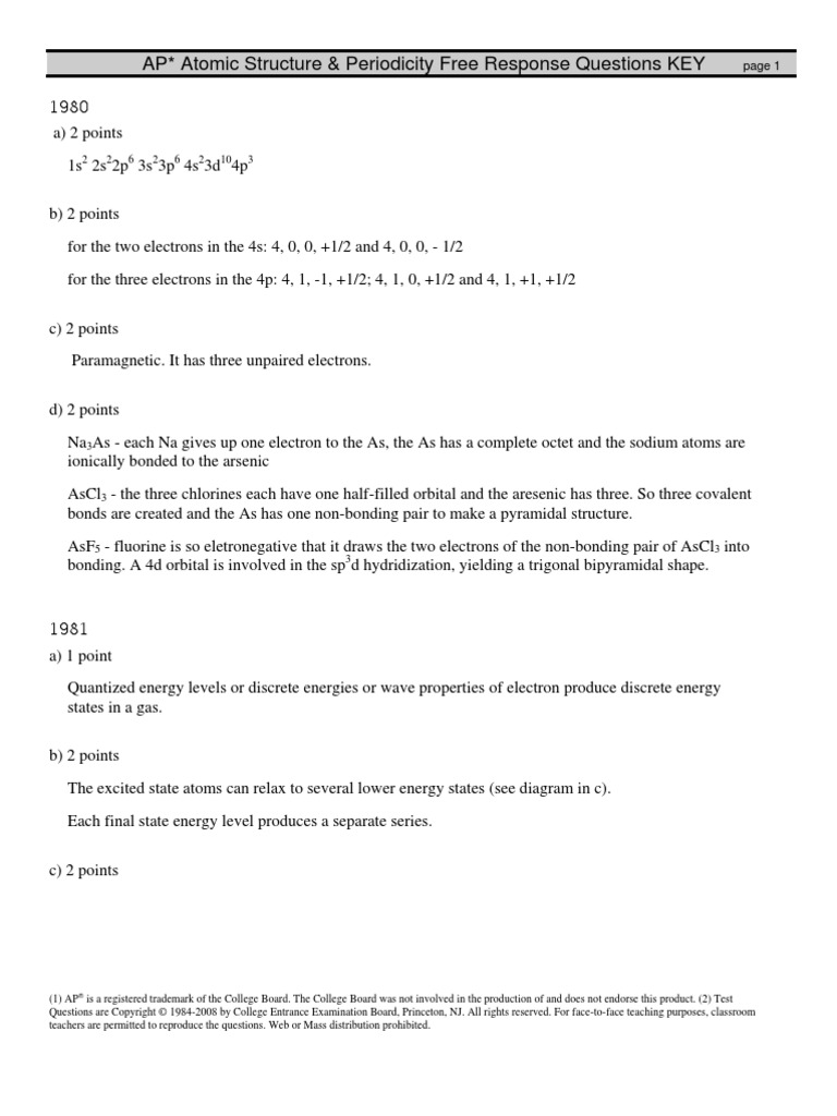 Ap Atomic Structure Periodicity Free Response Questions Key