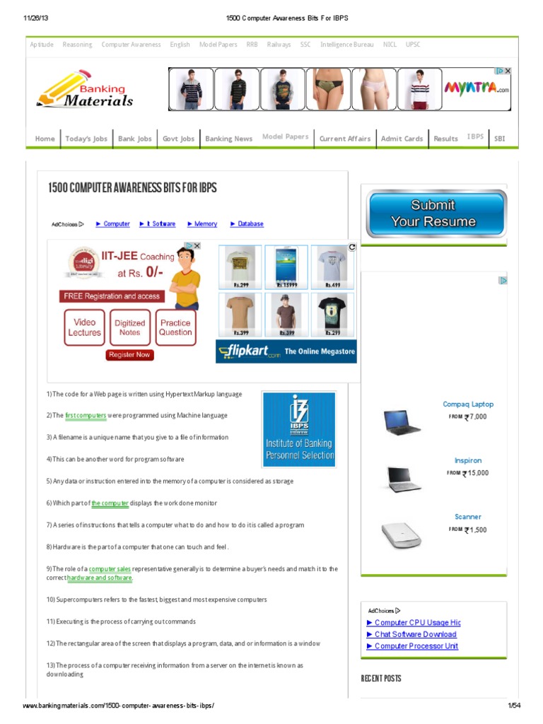 1500 Computer Awareness Bits For Ibps Computer Data Storage