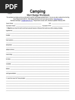 Camping merit badge workbook this workbook can help you but you still need to read the merit badge pamphlet. According to your camping merit badge you have to complete your tasks also known as camping merit badge requirements and write them on your worksheet so that they can be presented to your counselor or your team leader. Explain to your counselor the most likely hazards you may encounter while participating in camping activities and what you should do to anticipate help prevent mitigate and respond to these hazards.