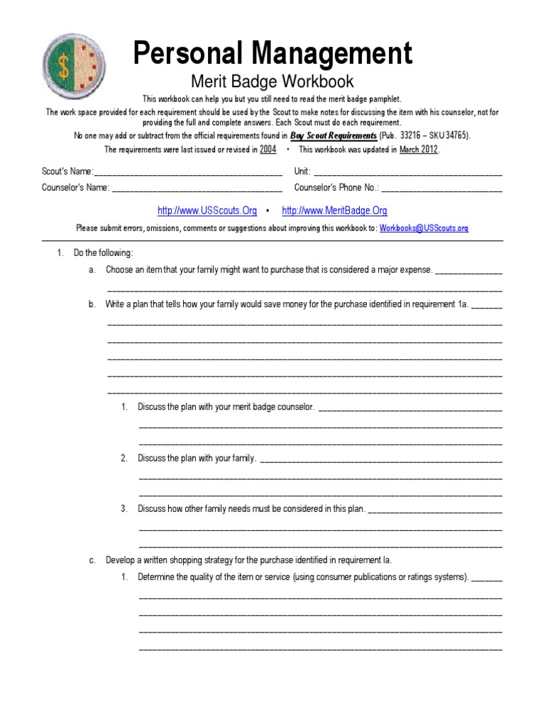 Personal Management Bsa Merit Badge Worksheets Boy Scouts Of