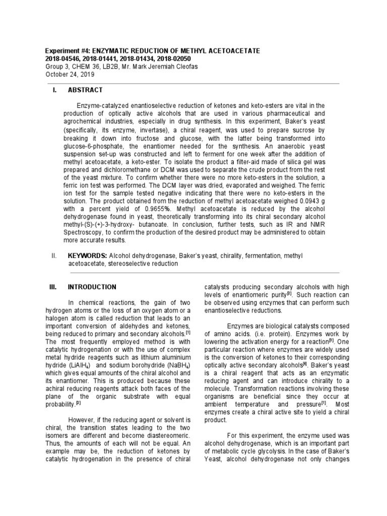 Experiment 4 Enzymatic Reduction Of Methyl Acetoacetate Redox