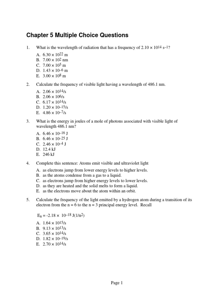 Chapter 5 Multiple Choice Questions Electron Configuration
