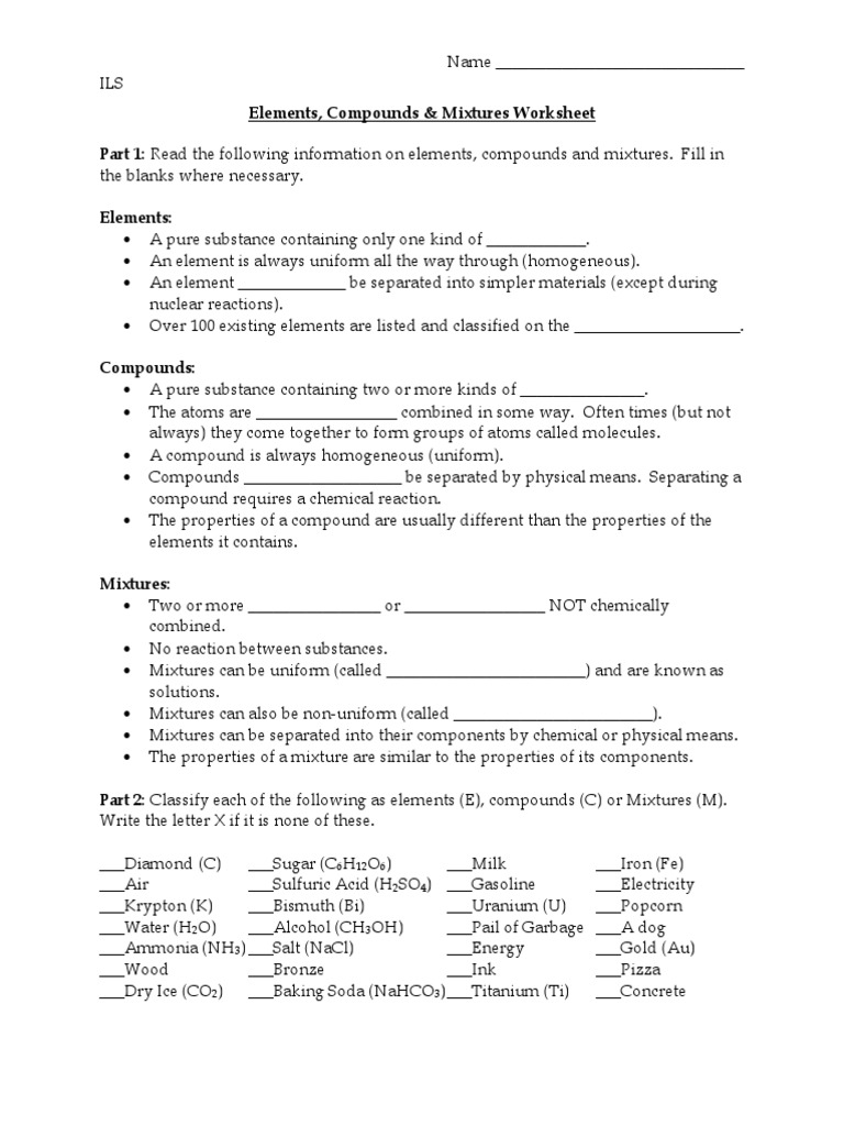17 Best Images Of Elements Compounds And Mixtures Worksheet Answer