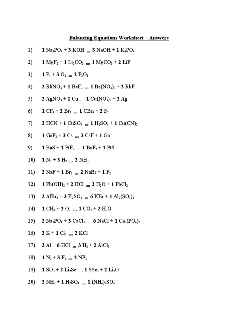 Balancing Equations Worksheet Answers Chemical Substances Mole