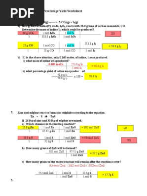 Limiting Reagents And Percentage Yield Worksheet Answers Doc
