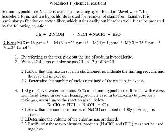 Worksheet 1 Chemical Reaction Sodium Hypochlorit Chegg Com