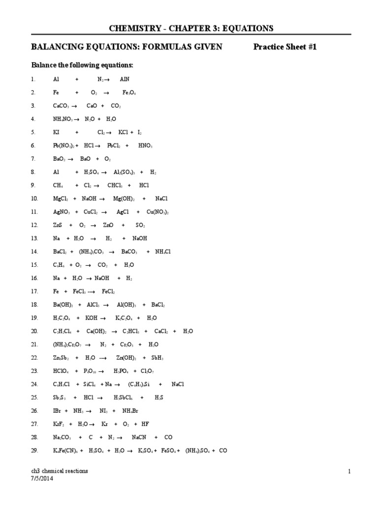 Ch 3 Chemical Reaction Worksheet Chemistry Chapter 3 Equations
