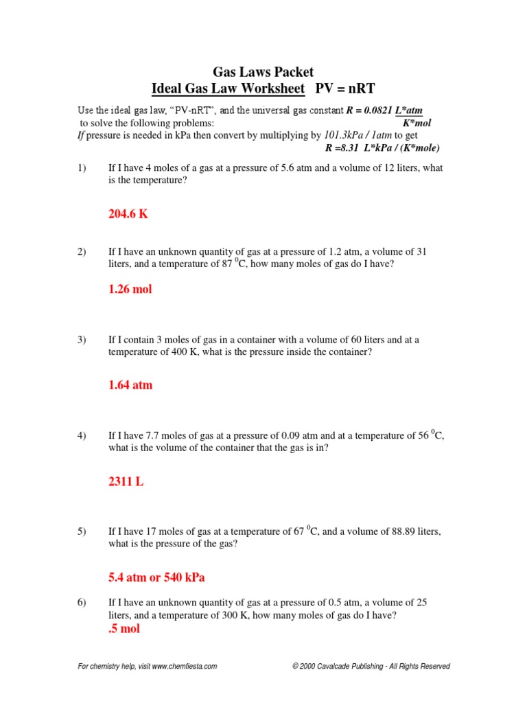Gas Laws Packet 2 Answers Gases Mole Unit